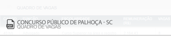 As inscrições para o concurso público de da Prefeitura de Palhoça – SC abriram no dia 21 de dezembro de 2021 e vão até 04 de fevereiro de 2022. Para se inscrever é só acessar o site da própria prefeitura e preencher as informações solicitadas, bem como realizar o pagamento da taxa de inscrição. Assim sendo, profissionais de nível fundamental pagam R$ 65,00, os de nível médio/técnico R$ 80,00 e os de nível superior R$ 95,00.