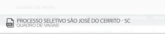 O Processe Seletivo da Prefeitura de São José do Cerrito contará com 02 etapas no momento da seleção de candidatos. Conforme diz o edital, a realização da primeira etapa (proa escrita) será para todos os cargos, já a da segunda, apenas para alguns específicos. Só para ilustrar, haverá prova prática para a vaga de “Motorista, Operador de Máquinas” e prova de títulos para os cargos de nível superior.