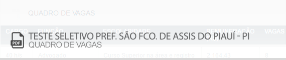 As vagas oferecidas pela Prefeitura de São Francisco de Assis do Piauí/PI são para profissionais de nível técnico e superior e podem ser conferidas com maiores detalhes clicando no quadro abaixo: