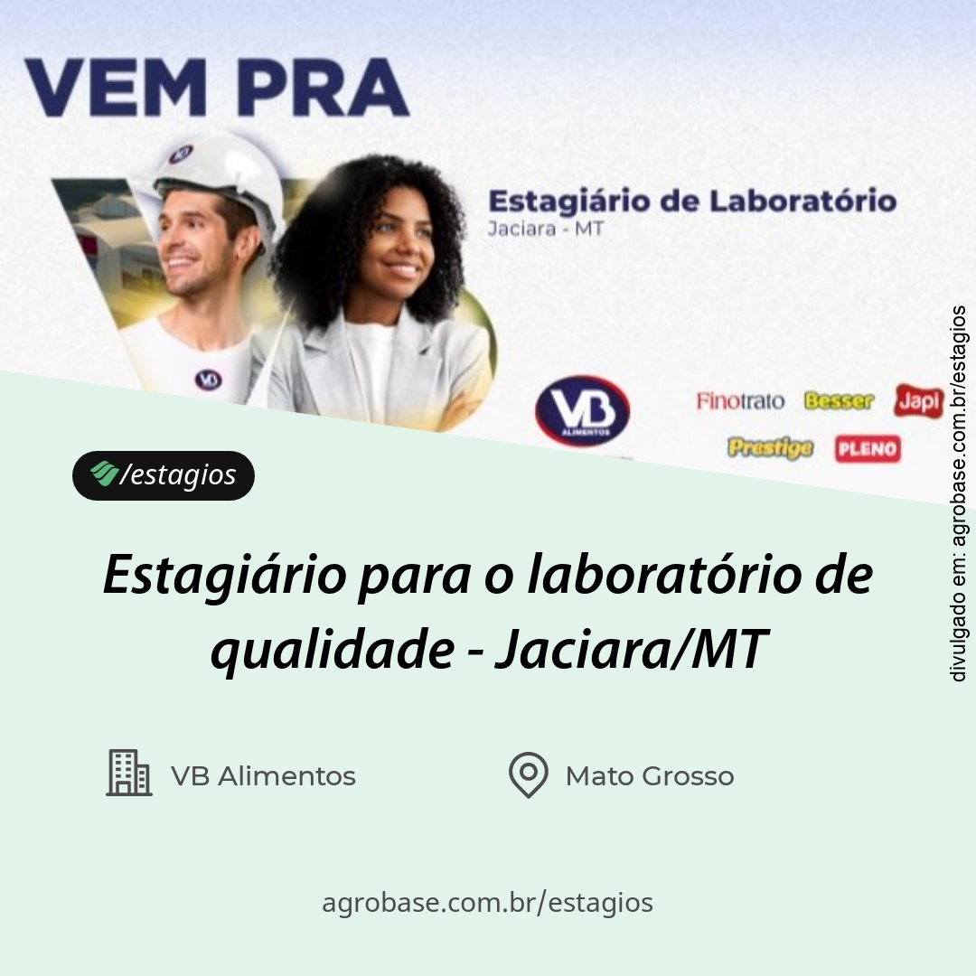 Estamos em busca de um estagiário de laboratório para integrar nossa equipe de controle de qualidade, contribuindo com a padronização e organização das rotinas analíticas, garantindo a confiabilidade dos resultados e o apoio às operações diárias. A vaga oferece a oportunidade de aprendizado prático em um ambiente dinâmico, com contato direto com equipamentos modernos, análises laboratoriais e sistemas de gestão de resultados, como NIR e SAP.