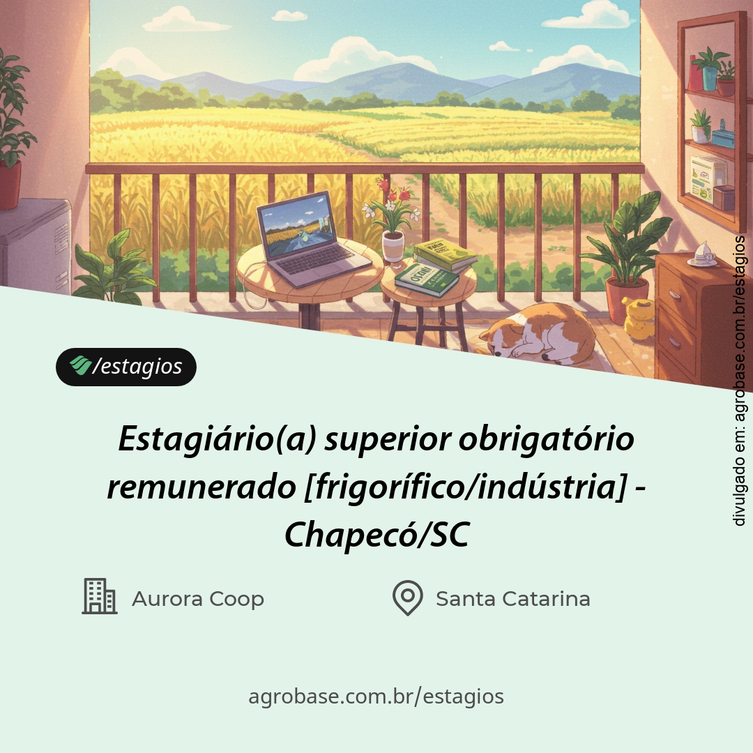 - A área de frigorífico/indústria possui mais de 100 oportunidades para estágio superior obrigatório, distribuídas nos setores: produção, controle de qualidade e produtividade.