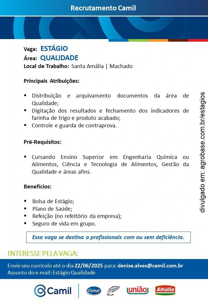 Alô universitários! Temos vaga de estágio aberta para atuar na unidade da Santa Amália | Camil Alimentos. Venha fazer parte do nosso time de Qualidade.