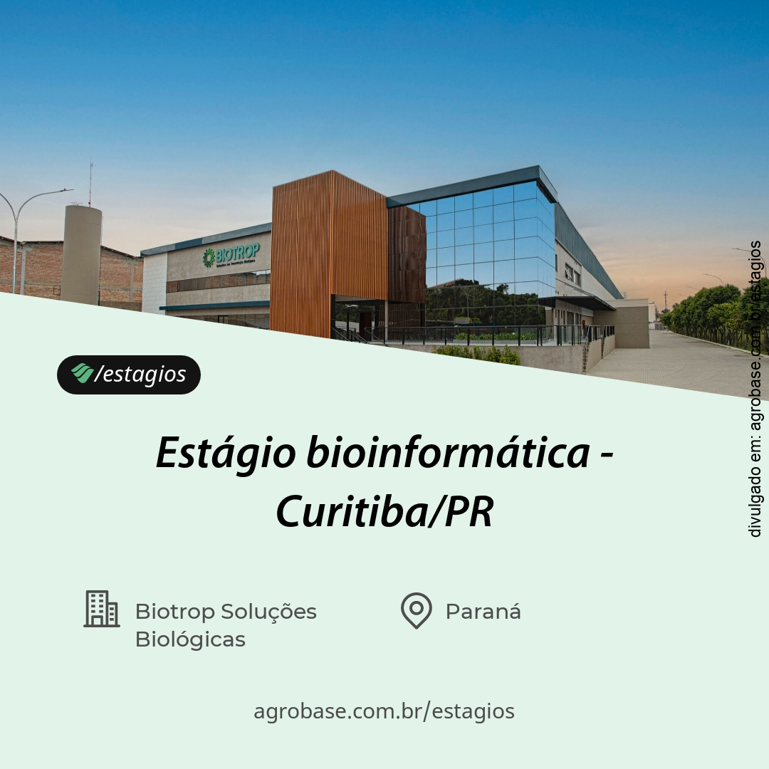 Estamos com oportunidade na área de bioinformática, na cidade de Curitiba PR, venha fazer parte do nosso #BioTeam! A Biotrop, empresa líder no mercado de biológicos do Brasil, oferece o que há de melhor no mundo em soluções biológicas e naturais.