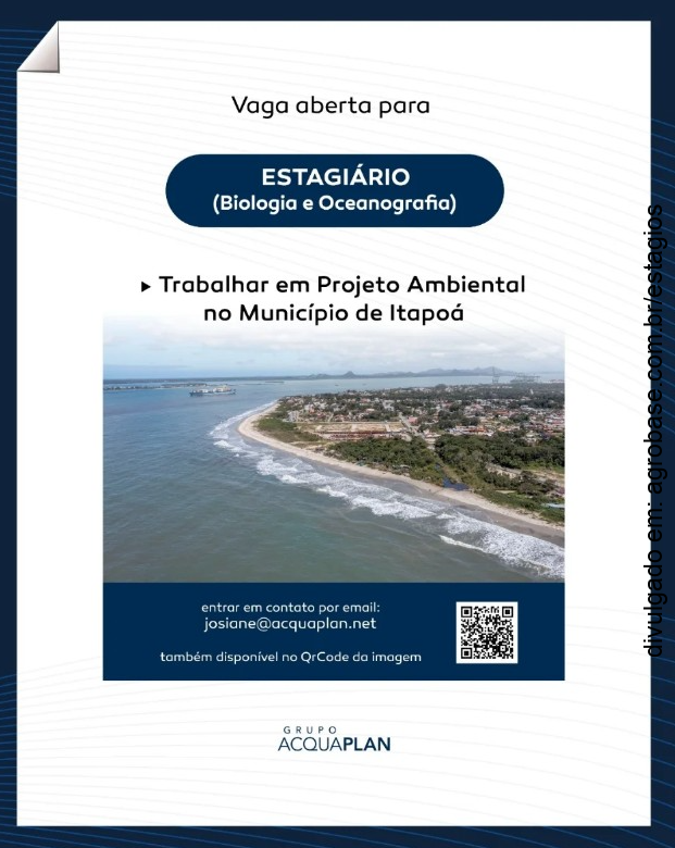 Grupo Acquaplan abre vaga para estagiário em biologia e oceanografia, para trabalhar em Projeto Ambiental no Município de Itapoá/SC. Início imediato.