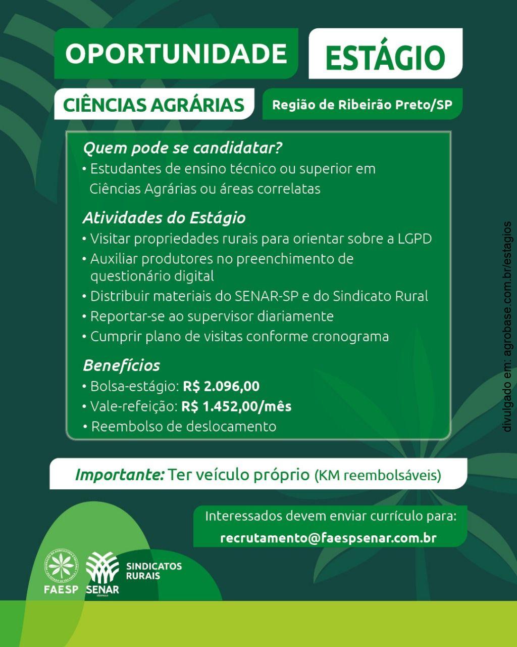 O Sistema FAESP/SENAR-SP está com vaga aberta para estudantes de Ciências Agrárias ou áreas correlatas (nível técnico ou superior).