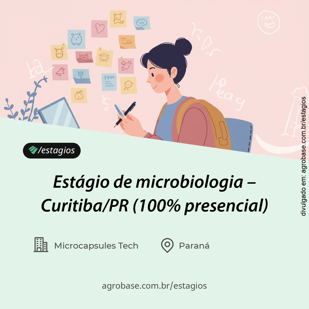 Você é estudante de biotecnologia, eng. de bioprocessos, química, biologia, ou áreas afins e busca aplicar e desenvolver seus conhecimentos em projetos de inovação? A microcapsules tech está com uma vaga de estágio aberta para integrar nosso time de p&d em microbiologia aplicada a bioinsumos, atuando em projetos com foco em sustentabilidade, biocontrole e tecnologia de microencapsulamento.