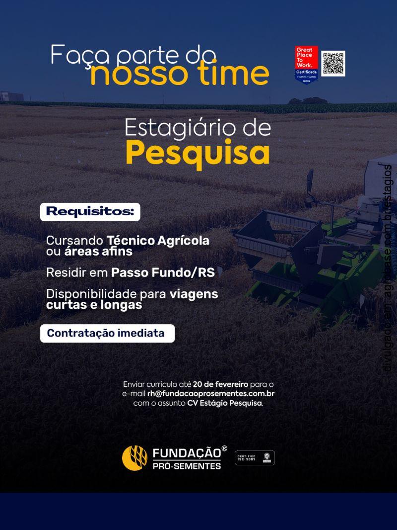 Estamos contratando estagiário para a área de pesquisa em Passo Fundo/RS. Envie seu currículo até 20 de fevereiro para o e-mail [email protected] e venha fazer parte do time FPS.