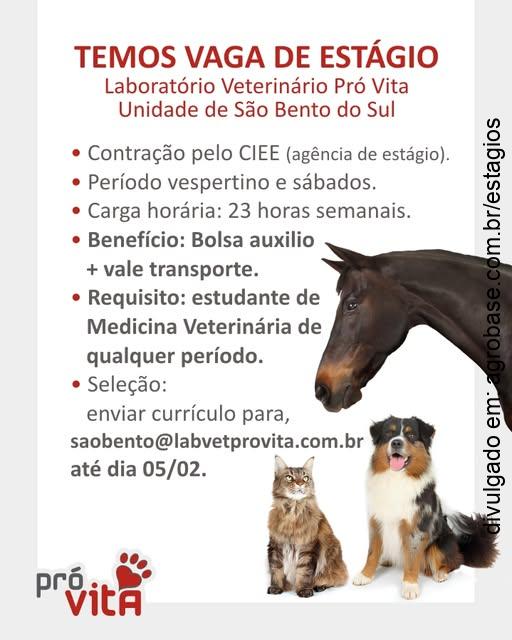 Atenção estudantes de medicina veterinária na região de São Bento do Sul (SC). O laboratório Veterinário Pró Vita, unidade de São Bento do Sul tem oportunidade de estágio!