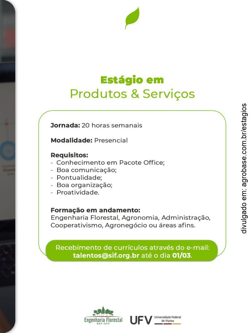 - Formação em andamento: engenharia florestal, agronomia, administração, cooperativismo, agronegócio ou áreas afins.