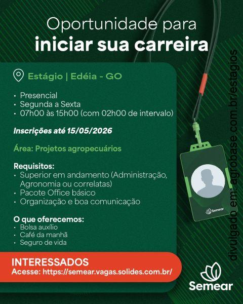 Oportunidade para iniciar sua carreira. Estágio em projetos agropecuários na Semear Engenharia Agronomica Ltda, em Edéia – GO.