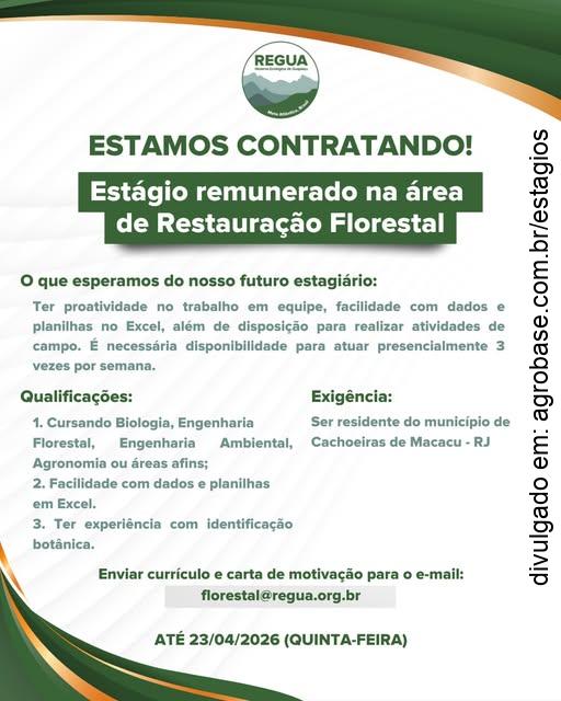 Reserva Ecológica de Guapiaçu está em Reserva Ecológica de Guapiaçu. Vaga de Estágio em Restauração Florestal na Reserva Ecológica de Guapiaçu (REGUA)! Se você está cursando Biologia, Engenharia Florestal, Ambiental, Agronomia ou áreas afins, essa é a chance perfeita para fazer a diferença com a gente!