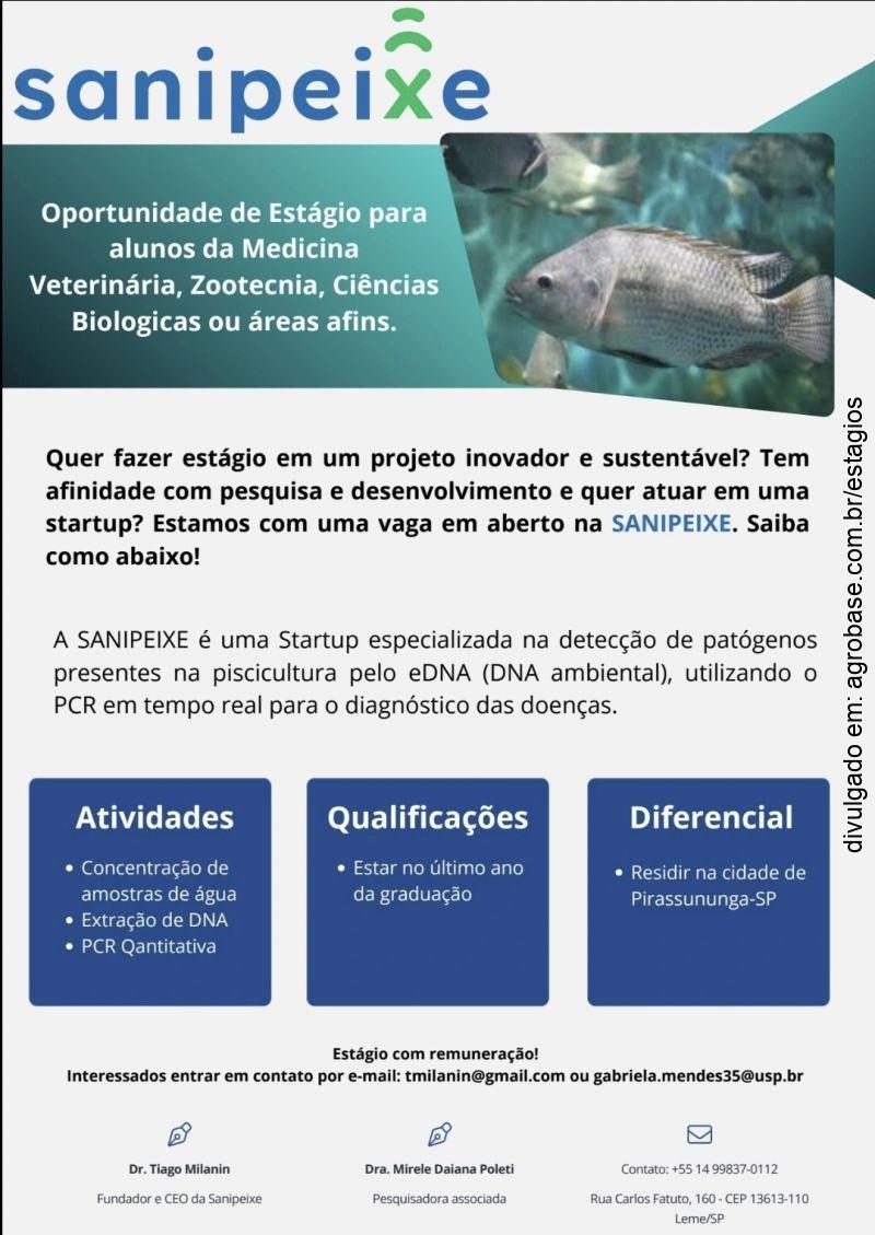 Quer fazer estágio em um projeto inovador e sustentável? Tem afinidade com pesquisa e desenvolvimento e quer atuar em uma startup? Estamos com uma vaga em aberto na SANIPEIXE.