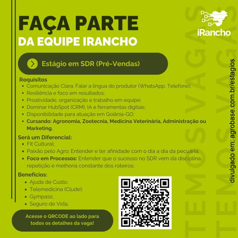 Vem ser iRancho! Vaga de Estágio em SDR (Pré-Vendas). A equipe iRancho está crescendo e estamos em busca de estagiários que saibam “falar a língua do produtor”. Buscamos talentos proativos e que entendam a rotina do produtor rural para atuar em nossa sede em Goiânia-GO.