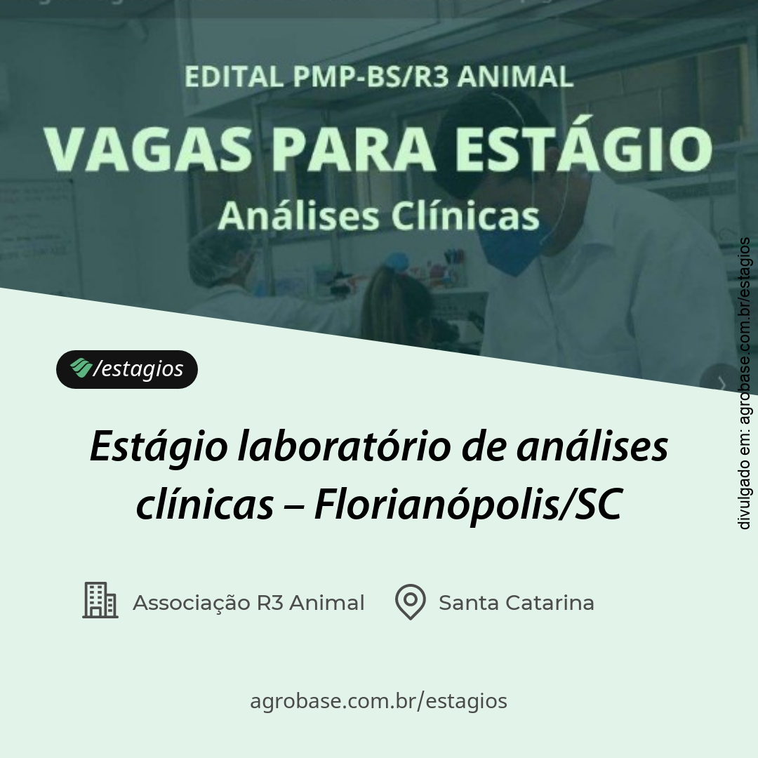 Oportunidade de estágio remunerado (modalidade extracurricular) no laboratório de análises clinicas da Associação R3 Animal, executora do Projeto de Monitoramento de Praias da Bacia de Santos (PMP-BS), em Florianópolis/SC.