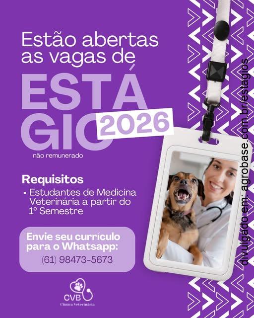 Seu futuro na medicina veterinária começa aqui. Estão abertas as vagas de estágio 2026 na CVB clínica veterinária. Se você é estudante de medicina veterinária a partir do 1º semestre e quer viver a prática, aprender com profissionais qualificados e desenvolver sua paixão pelo cuidado animal, essa é a sua oportunidade.