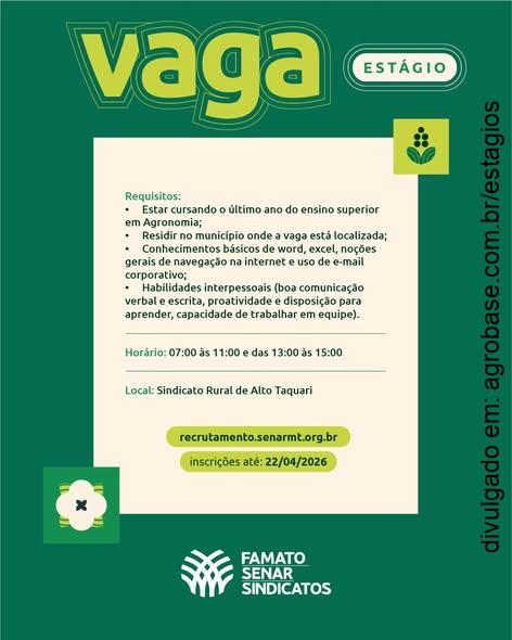 O Senar Mato Grosso está com vaga de estágio na cadeia produtiva de Hortifruticultura, em Alto Taquari. Se você está no último ano de Agronomia, essa é a oportunidade de aprender na prática, desenvolver suas habilidades e crescer no agro.