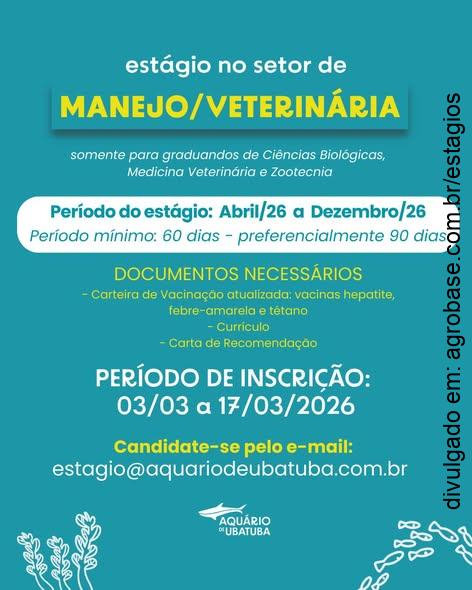 O Aquário de Ubatuba está com processo seletivo aberto para estágio no setor de Manejo/Veterinária. Uma oportunidade para estudantes que desejam vivenciar, na prática, a rotina de manejo, cuidado e bem-estar de animais marinhos dentro de uma das instituições de educação ambiental mais reconhecidas do litoral brasileiro.