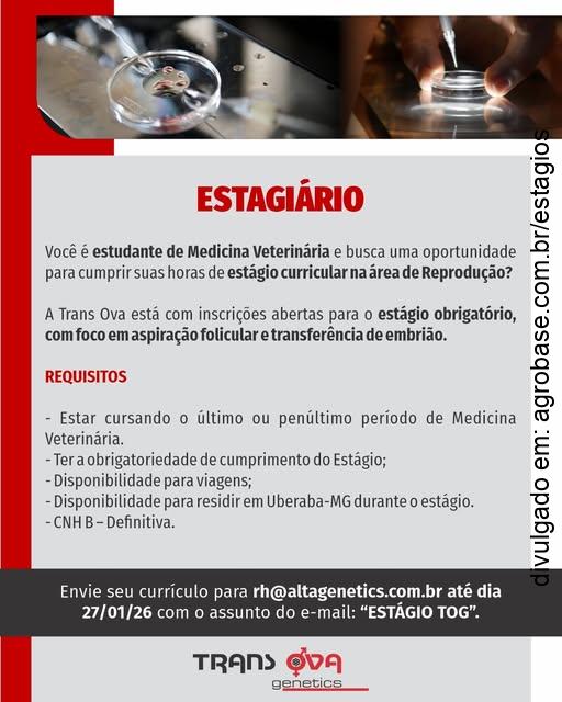 Atenção estudantes de Medicina Veterinária. A Trans Ova está com inscrições abertas para estágio com foco em aspiração folicular (OPU) e transferência de embriões, oferecendo vivência prática em um ambiente de alta tecnologia e referência no setor.