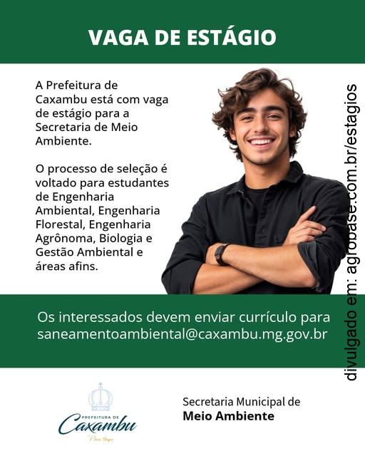 A Prefeitura de Caxambu informa que está aberta vaga de estágio para estudantes de Engenharia Ambiental, Engenharia Florestal, Engenharia Agrônoma, Biologia e Gestão Ambiental e áreas afins, para atuar na Secretaria Municipal de Meio Ambiente.