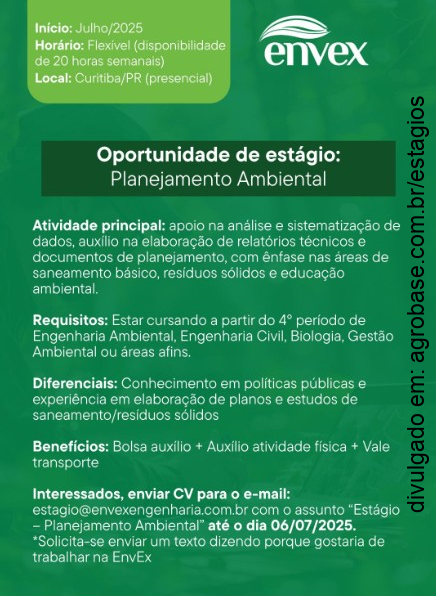 Estar cursando a partir do 4° período de Engenharia Ambiental, Engenharia Civil, Biologia, Gestão Ambiental ou áreas afins.