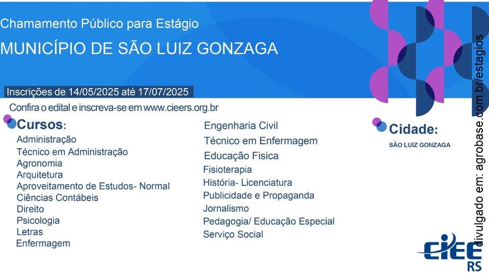 03 de novembro Estágio em diversas áreas – São Marcos/RS Prefeitura Municipal de São Ma... Rio Grande do Sul