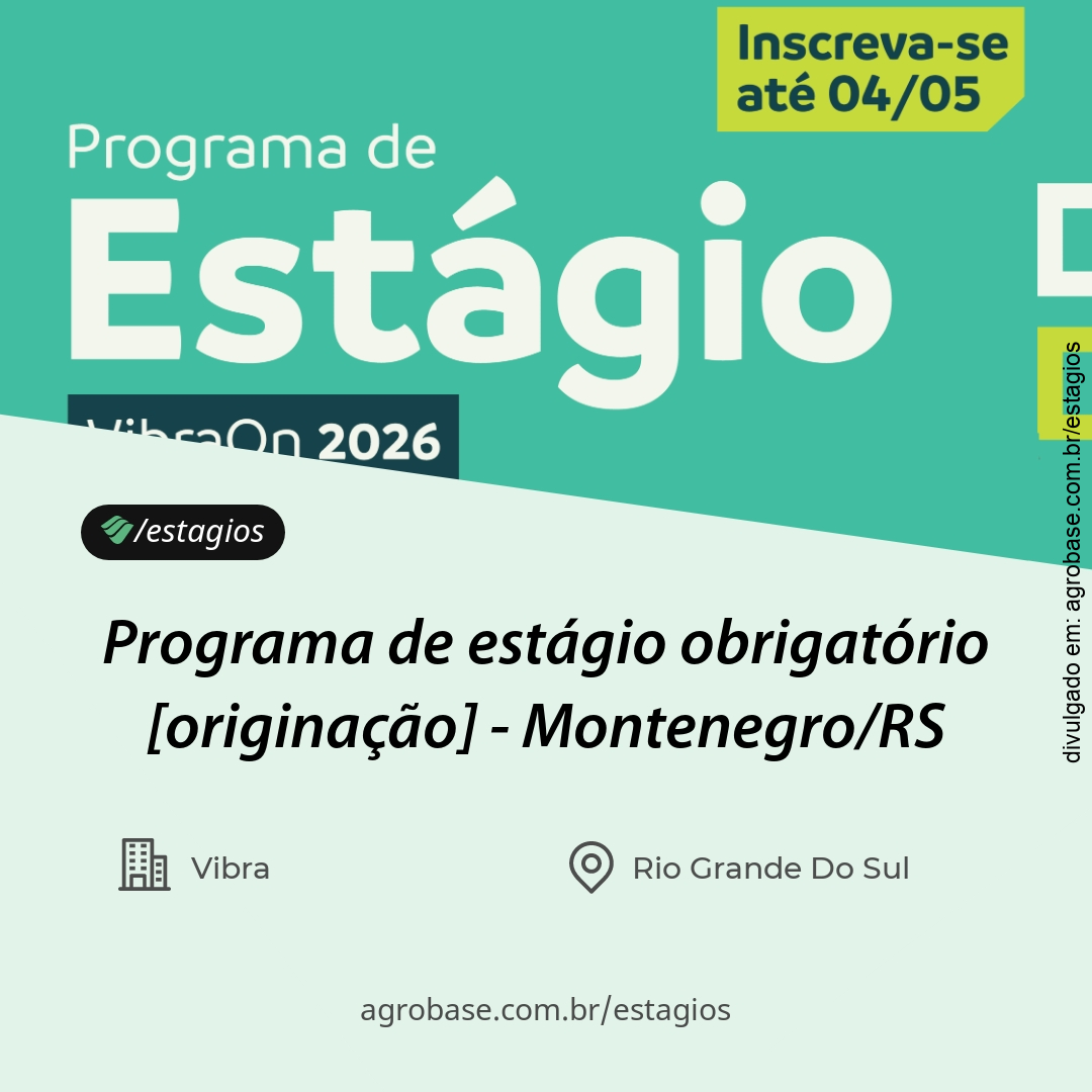 A Vibra Foods abre inscrições para o Programa de Estágio Obrigatório Originação 2026. A Vibra, uma das maiores empresas brasileiras do setor de alimentos e referência mundial em avicultura, abre inscrições para seu Programa de Estágio Obrigatório na área de Originação. As vagas estão disponíveis em diferentes unidades da companhia, oferecendo aos estudantes a oportunidade de desenvolver suas habilidades em um ambiente de inovação, qualidade e crescimento contínuo.